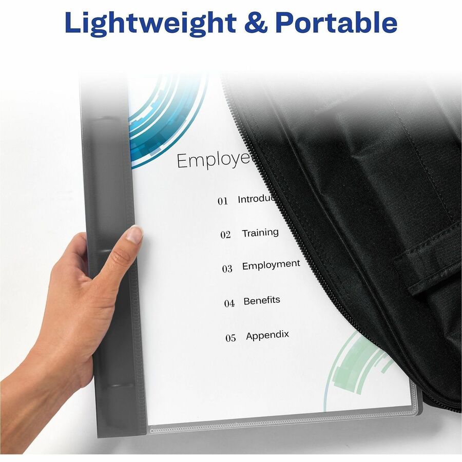 Make your next presentation or proposal one to remember. With this Flexible Binder, you're ready to show off your knowledge, organizational skills and style. The 3 ring presentation binder's flexible design makes it compact and easily portable, but still durable enough to keep your pages securely enclosed. The translucent spine and back cover give your clear view binder a pop of color to highlight your title page. You can quickly and easily customize your title page and front inside cover of the flexible 3 ring binder with the free templates and designs on the Avery website. Simply print out the page and insert it in the clear title page pocket. This durable binder is made from PVC free, non-stick poly material that prevents ink and toner transfer, keeping your pages neat and presentable. Your 3 hole punched papers stay secure with the 1 inch round rings that can hold up to 175 sheets of 8.5" x 11" paper. The poly binder is also compact and lightweight making it easy to store and transport to and from the office. Deliver a presentation that's dressed to impress with this flexible 3 ring binder. |