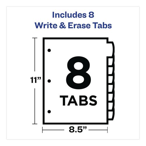 Write & Erase durable plastic dividers let you write, erase and reuse your dividers for easy changes at any time. Simply write directly on the tabs with a ballpoint pen or pencil, and erase as needed. You can also take quick notes on the divider body and easily erase later. Made from ultra-durable, tear-resistant plastic, these dividers are ideal for frequent use in any three-ring binder. The Big Tab™ design offers 1.5 times more writing space than standard divider tabs, and the multiple colors allow for quick referencing. Ideal for your personal organization at home, work and school.