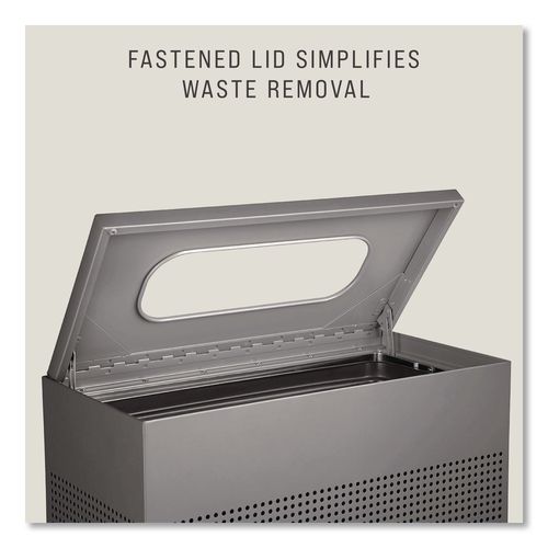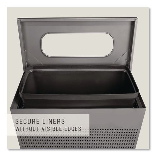 Offers functional litter control in an elegant design. The garbage can has an open top with a vinyl trimmed disposal opening. The trash can is made of fire-safe steel. Its wall-hugging design is ideal for areas where looks are important and space is limited. The lift-off trash can body makes it easier to empty and has a rigid plastic liner that will not leak.