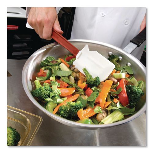 The Rubbermaid Commercial High Heat Spatula is an all-purpose scraper ideal for use in any industrial-size kitchen. This rubber spatula has a red nylon handle with white silicone blade. The scraper resists heat up to 500 degrees Fahrenheit (260 degrees Celsius) and is stain resistant and will not scratch cookware. The spatula measures 16-1/2 inches and is commercial dishwasher safe. This rubber spatula is certified to National Sanitation Foundation (NSF) standards for food safety.